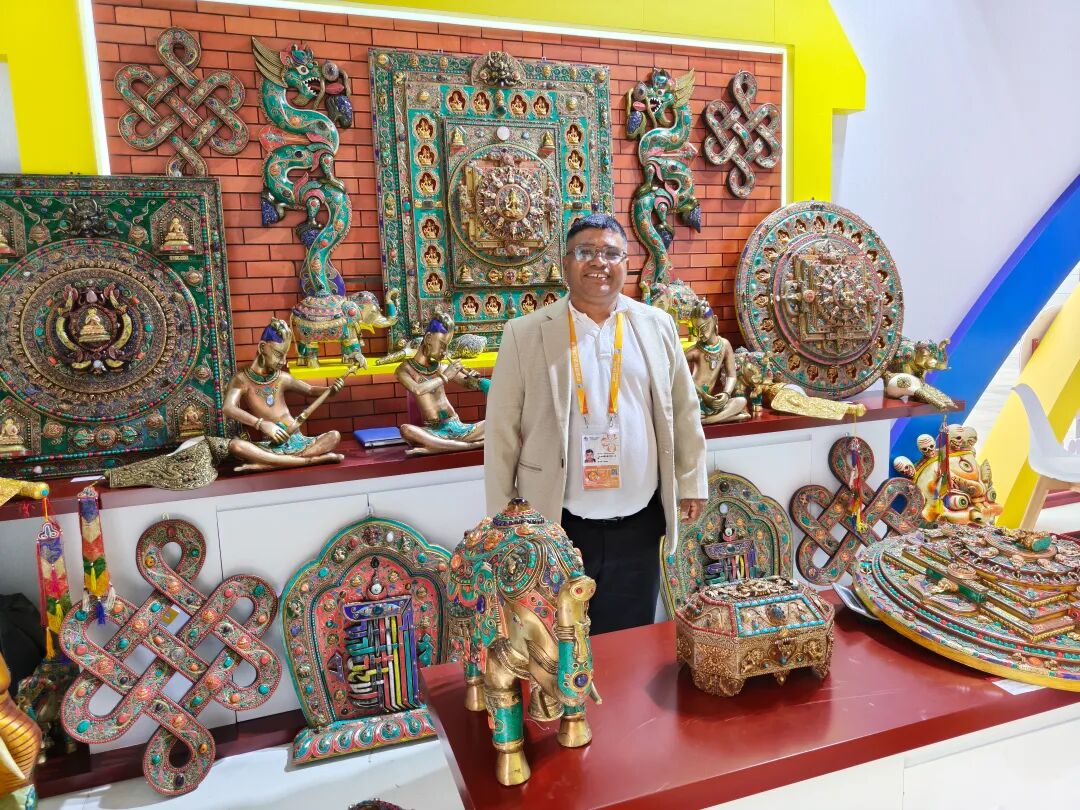 壁画的旁边,是来自尼泊尔的另一家展商“尼泊尔D品牌银器”,该企业在拉萨大昭寺前设有分店,负责人告诉记者,这些银器工艺传承自家技艺,由家庭工坊制作而成。