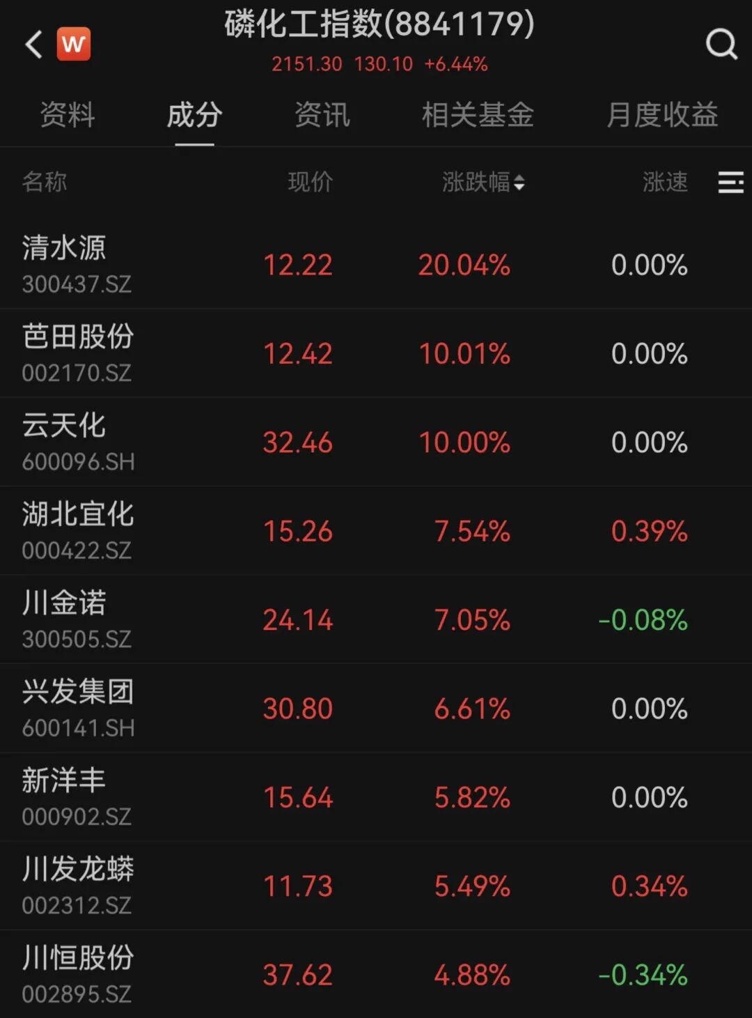 11月6日,A股磷化工板块全线爆发,截至13:30,Wind磷化工指数大涨6.44%,清水源强势斩获20%涨停,芭田股份、澄星股份、云天化录得10%涨停,湖北宜化、川金诺、兴发集团、新洋丰、川发龙蟒、川恒股份、史丹利等个股跟涨。