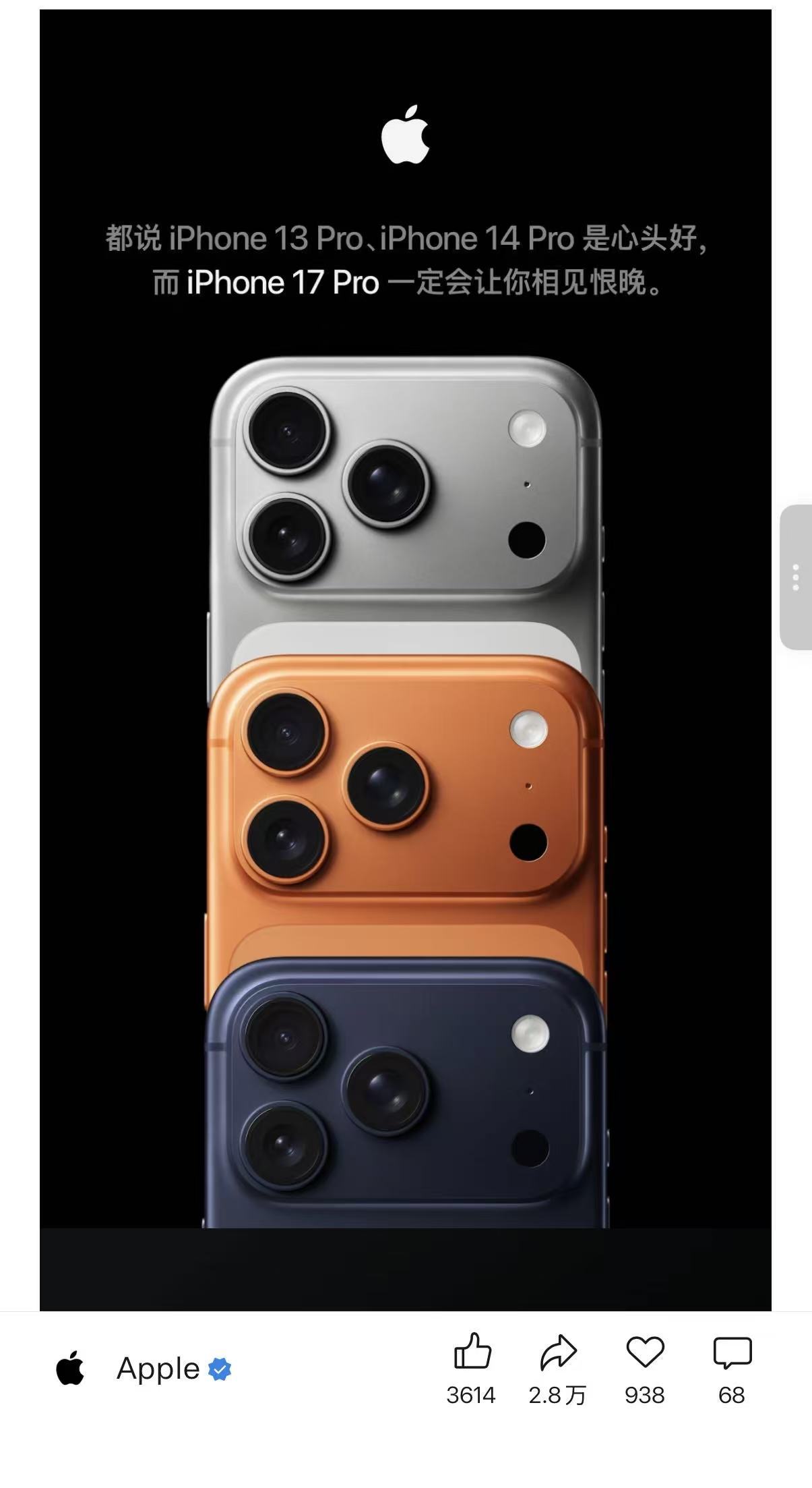 苹果在文中表示,都说iPhone 13 Pro、iPhone 14 Pro是心头好,而iPhone 17 Pro一定会让你相见恨晚。苹果一一列出了iPhone 17 Pro与iPhone 13 Pro、iPhone 14 Pro在影像、性能、电池与设计等方面的详细对比,并强调“论外形,拼实力、比影像,要出片,还得是iPhone 17 Pro。”