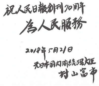 2018年5月21日,村山富市为人民日报创刊70周年题写的致辞。