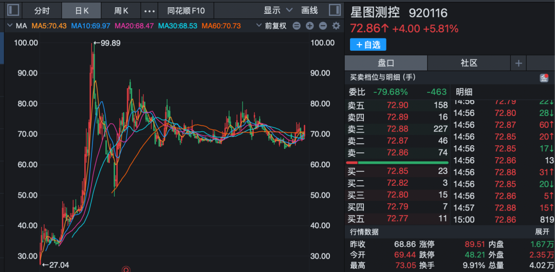 受此刺激,星图测控11月7日大涨5.81%。自今年1月2日上市以来,该股走势凌厉累计涨幅超13倍(发行价每股6.92元,最高曾冲高至99.89元),成为今年表现最牛的北交所新股。