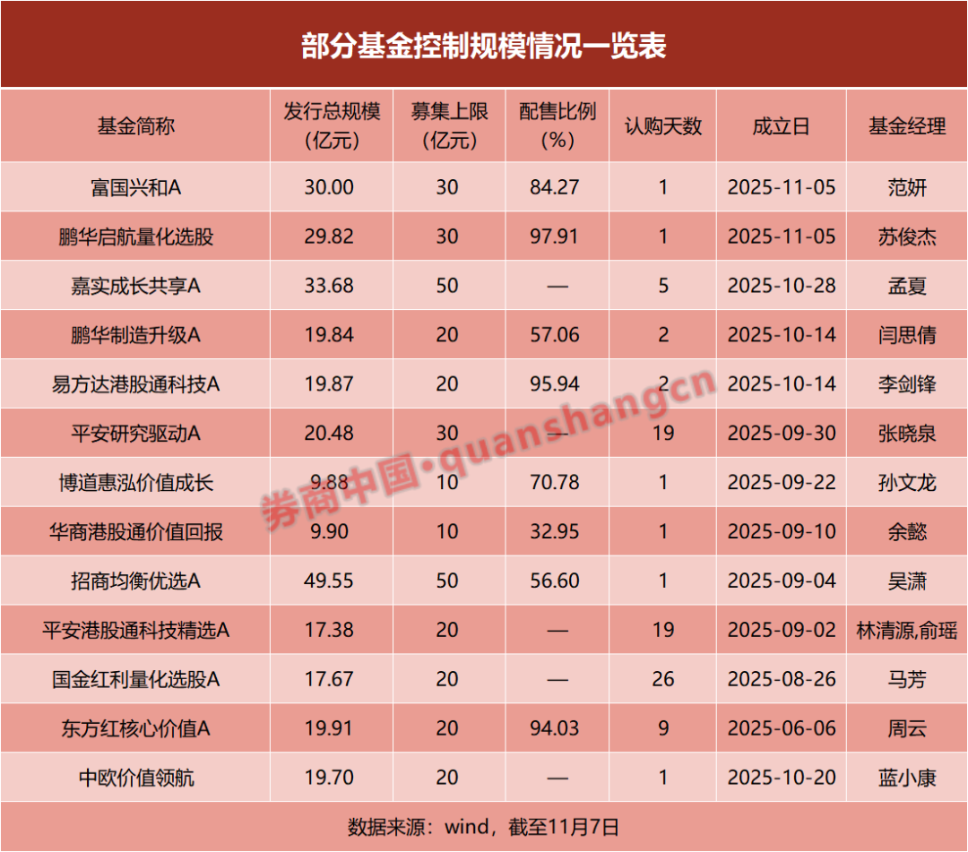 富国基金11月6日公告成立的富国兴和混合基金,是由知名基金经理范妍管理的新基金。该基金原募集期为11月3日至11月14日,因首日申购超30亿元上限提前结募,配售比例为84.27%,按该比例算一天内获得了近36亿元申购。于11月5日成立的鹏华启航量化选股,同样仅卖一天就触达30亿元募集上限,随后启动比例配售。