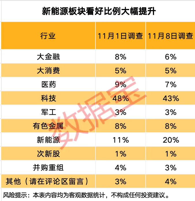 人民财讯11月9日电,11月8日,证券时报数据宝发布调查报告,截至最新,参与调查的已经接近3500人,从仓位变化来看,本周23%的受访者进行了“加仓”;18%的受访者进行了“减仓”;5%的受访者进行了“清仓”操作;其余54%持仓不动。对于下周A股走势,有约1810位受访者票选“站上4000点,并企稳走高”,占比52%,是最为主流的投资者观点;另有近980位受访者认为A股将“冲上4000点,但之后回落”,占比28%。其余20%的受访者对A股冲击4000点表示不看好。对于下周A股市场的潜力板块和方向选择,新能源板块看好比例大幅提升,由11%升至20%,环比上涨9个百分点,是下周受访者较为看好的板块;科技、医药、大金融板块最新调查结果分别环比下降5个百分点、2个百分点、2个百分点,最新依次为43%、7%、6%。