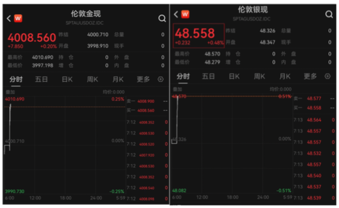 现货黄金开盘后直线拉升。截至发稿,现货黄金报4008.56美元/盎司,现货白银报48.558美元/盎司,涨幅分别为0.2%、0.48%。