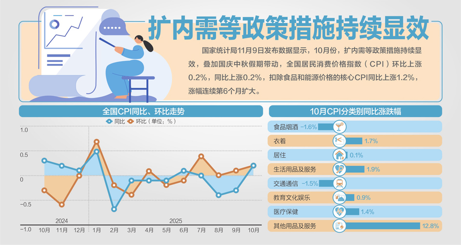 冯琳指出,往后看,主要受去年同期食品价格基数较大幅度下行影响,今年11月食品CPI同比降幅将继续收窄。值得注意的是,从近期政策动向上看,反内卷对汽车价格的支撑作用有望持续,促消费政策存在加码空间,也有望带动11月工业消费品价格同比数据改善,而服务价格同比涨幅将基本保持稳定。