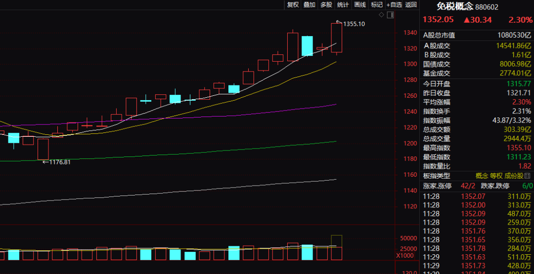 另一概念板块免税概念也大幅上涨,板块涨幅超过2%,龙头股中国中免涨停,东百集团也强势涨停。海汽集团、恺撒旅业、王府井、珠免集团等股票涨幅居前。免税概念板块近期连续大涨,总体表现居于A股市场前列。
