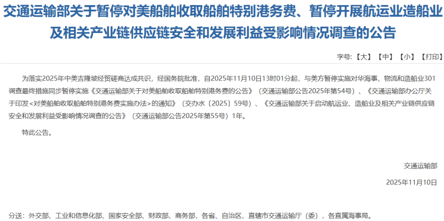 11月10日,交通运输部发布公告,为落实2025年中美吉隆坡经贸磋商达成共识,经国务院批准,自2025年11月10日13时01分起,与美方暂停实施对华海事、物流和造船业301调查最终措施同步暂停实施《交通运输部关于对美船舶收取船舶特别港务费的公告》(交通运输部公告2025年第54号)、《交通运输部办公厅关于印发<对美船舶收取船舶特别港务费实施办法>的通知》(交办水〔2025〕59号)、《交通运输部关于启动航运业、造船业及相关产业链供应链安全和发展利益受影响情况调查的公告》(交通运输部公告2025年第55号)1年。