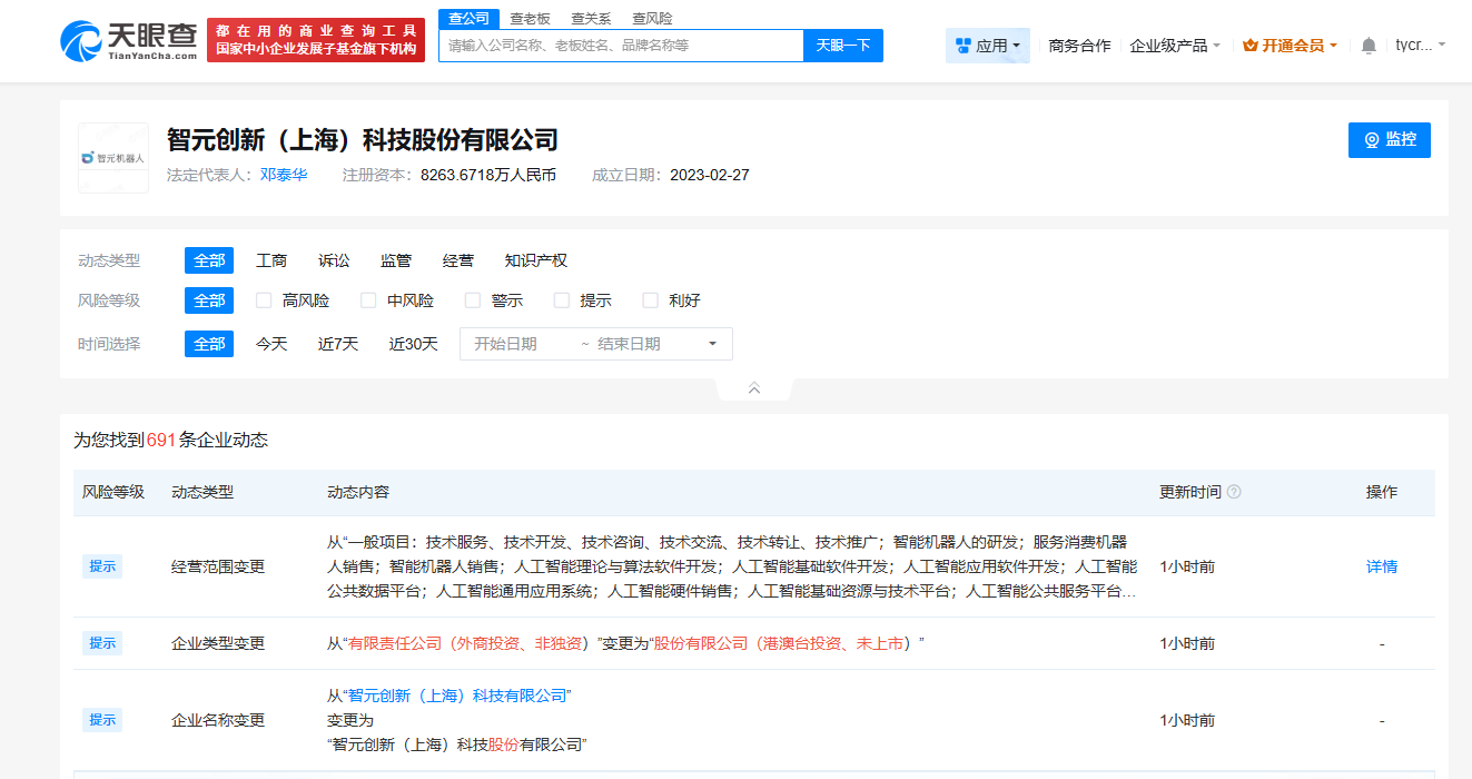 据天眼查工商信息显示,近日,智元机器人关联公司智元创新(上海)科技有限公司发生工商变更,企业名称变更为智元创新(上海)科技股份有限公司,企业类型从“有限责任公司(外商投资、非独资)”变更为“股份有限公司(港澳台投资、未上市)”。