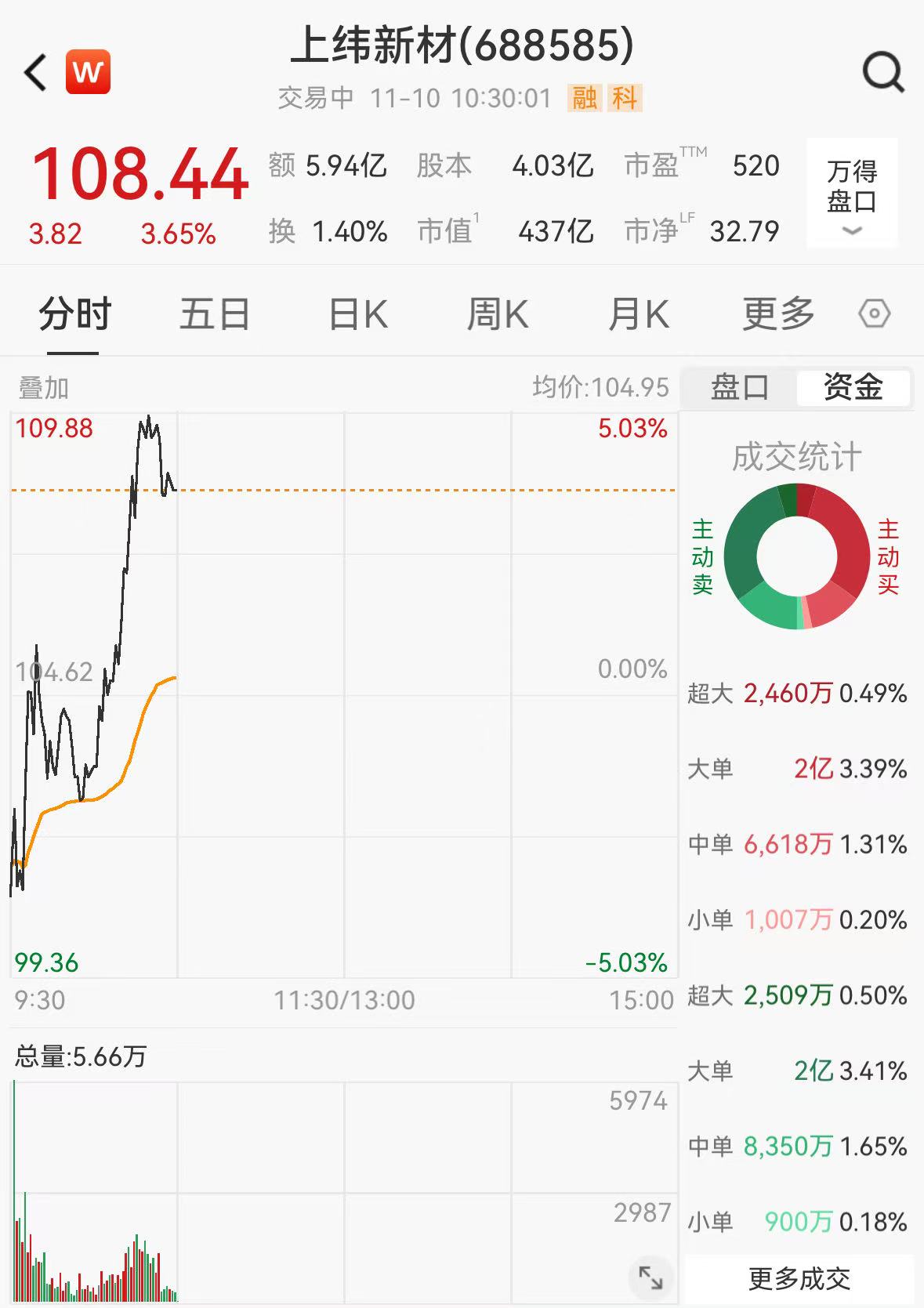 11月10日,上纬新材早盘半小时内一度涨近7%,截至10:30,报108.44元/股,总市值为437亿元。