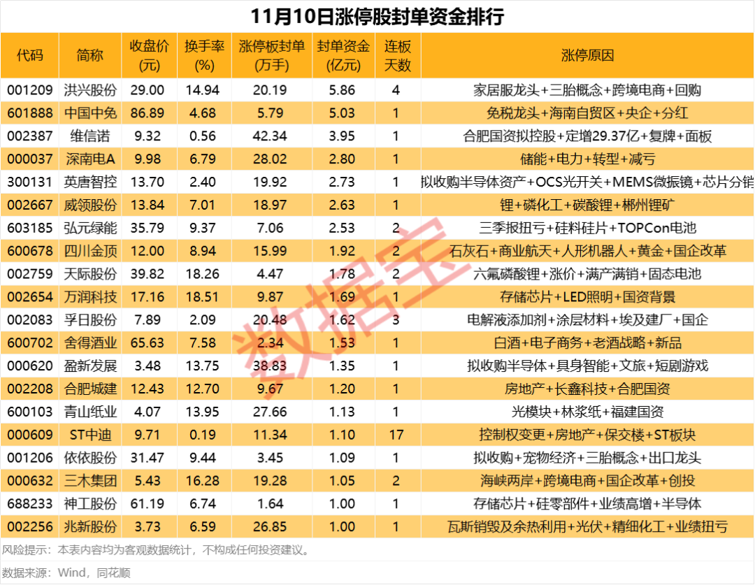 从连续涨停天数看,ST中迪斩获17连板;摩恩电气实现5连板;洪兴股份完成4连板;孚日股份、重庆建工、澄星股份、清水源和*ST绿康也均达成3个连续涨停。