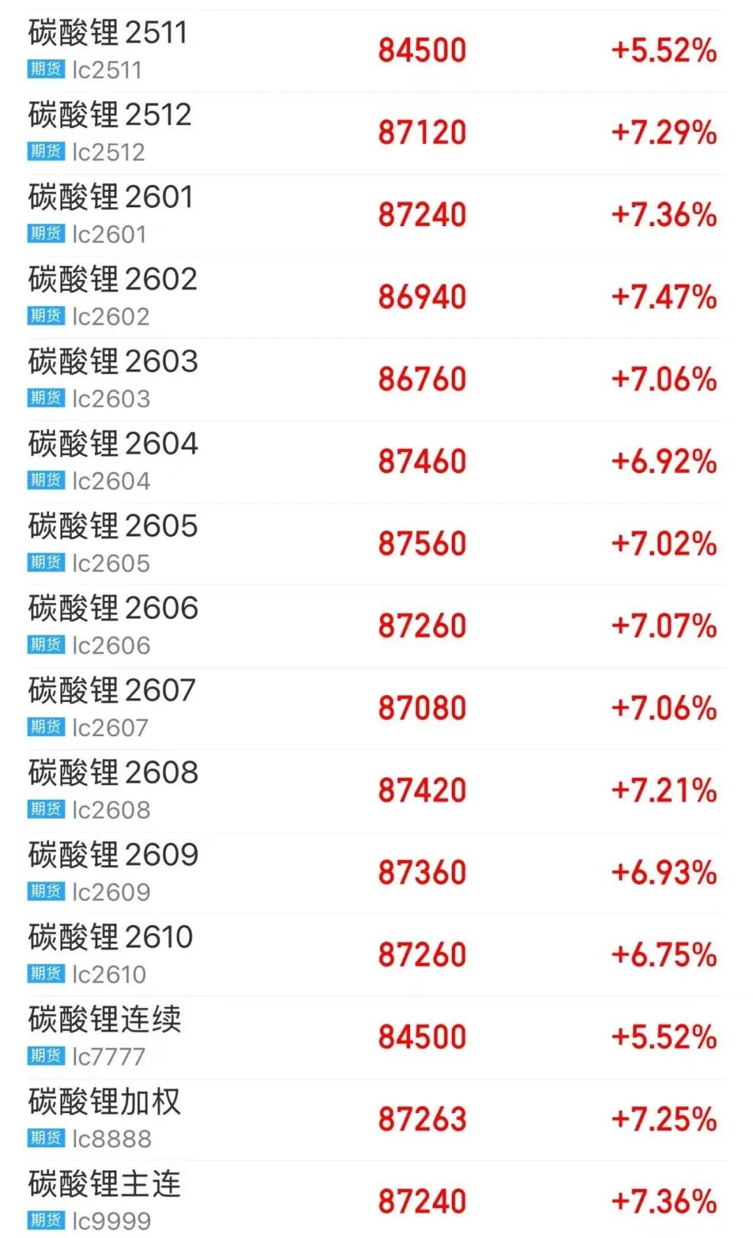 11月10日,碳酸锂期货价格大幅上行,持仓量增加5万余手。截至收盘,碳酸锂期货主力2601合约报收于87240元/吨,上涨7.36%,远月合约全线大涨。