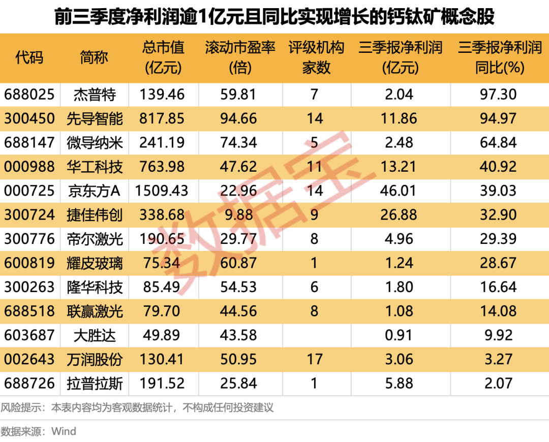 数据宝梳理了2025年前三季度净利润逾1亿元,且同比实现稳定增长的钙钛矿电池股,共计13只。其中,杰普特、先导智能、微导纳米净利润增幅居前,依次为97.3%、94.97%、64.84%。