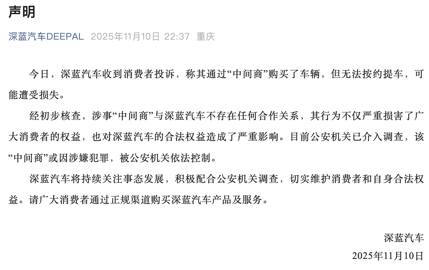 同一时间,长安汽车旗下另一大品牌深蓝汽车也发布相似声明。