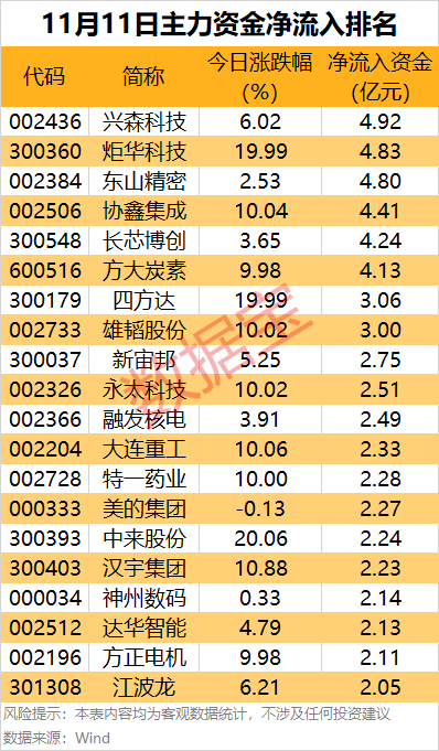 此外,东山精密、协鑫集成、长芯博创、方大炭素、四方达等主力资金净流入金额居前。