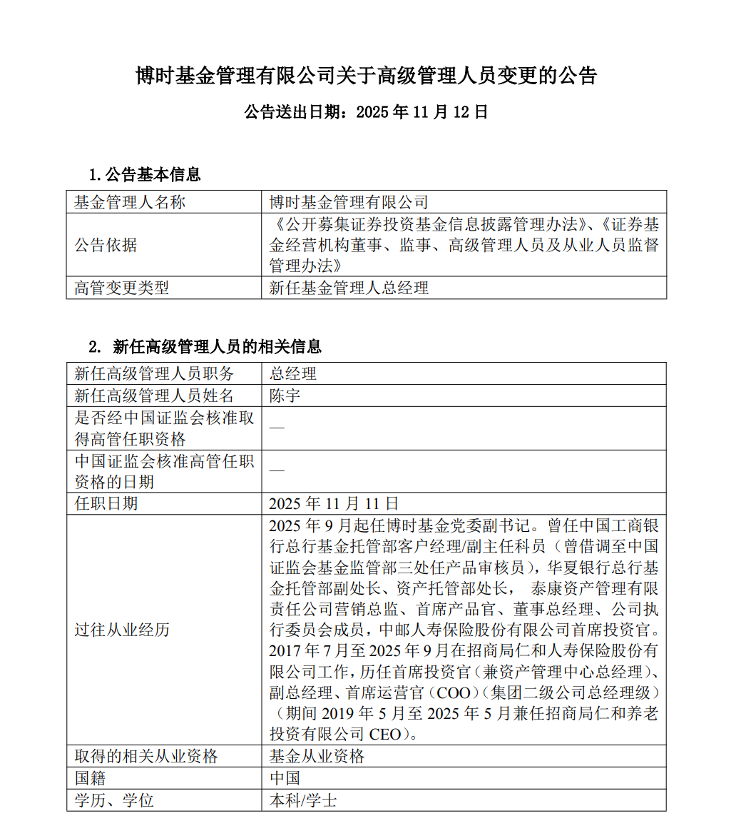 博时基金公告显示,经该公司第九届董事会2025年第七次临时会议审议并通过,博时基金党委副书记陈宇正式接任公司总经理。