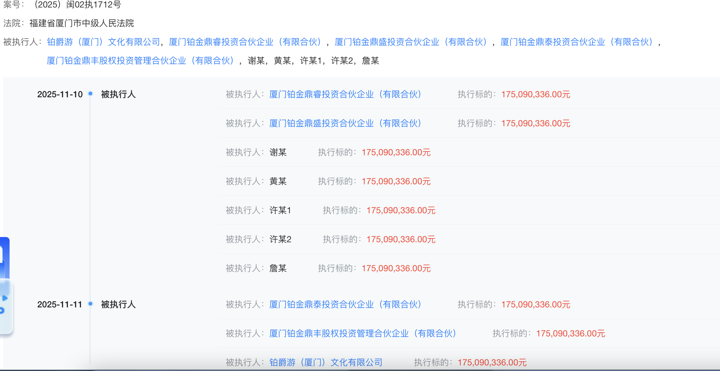 11月12日消息,天眼查APP显示,日前,许春盛、谢家章、许春德、厦门铂金鼎睿投资合伙企业(有限合伙)、厦门铂金鼎盛投资合伙企业(有限合伙)等新增一则被执行人信息,执行标的1.75亿余元,执行法院为福建省厦门市中级人民法院。