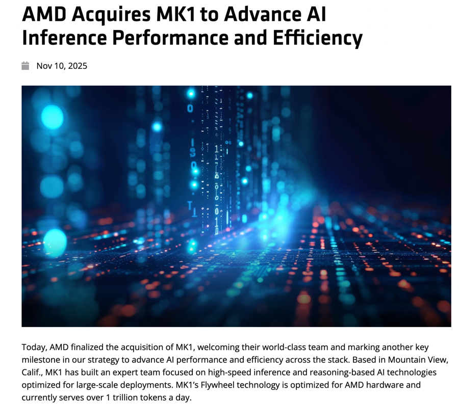 仅从近期看,11月10日,AMD宣布完成对MK1的收购。根据AMD的说法,“这标志着我们在提升全栈人工智能性能和效率战略中又一个关键里程碑。”
