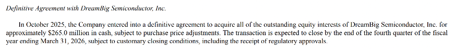 据悉在2025年10月,Arm与DreamBig Semiconductor签署最终协议,拟以约2.65亿美元现金收购后者全部已发行股权,收购价格可能会有调整。该交易预计在截至2026年3月末的2026财年第四财季末完成,具体取决于惯例成交条件,包括获得监管部门的批准。