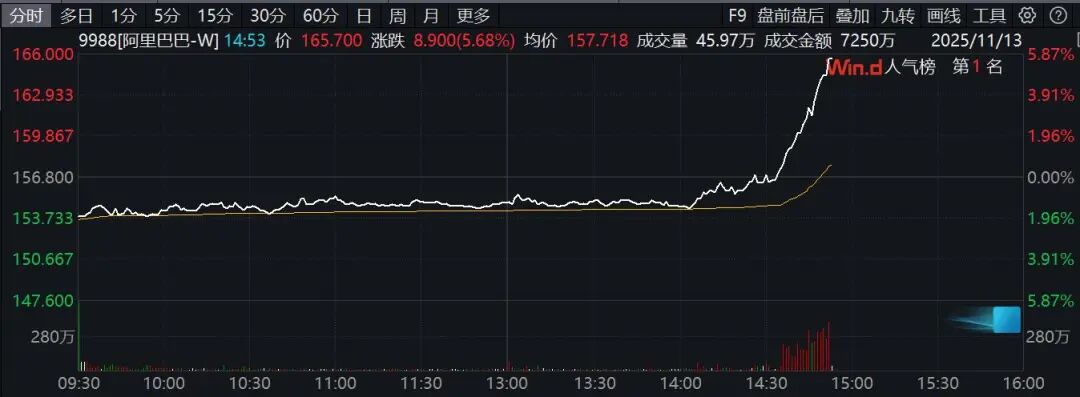 午后港股拉升,香港恒生指数、恒生科技指数均转为上涨。个股方面,阿里巴巴午后直线拉升转为上涨,盘中涨超5%。