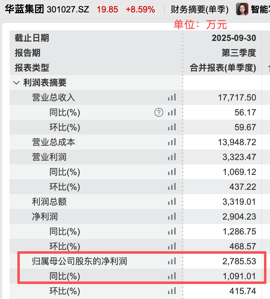业绩方面,2025年三季报显示,华蓝集团今年前三季度实现营业收入3.83亿元,同比增长24.64%;净利润992.16万元,同比增长142.28%。其中第三季度实现营业收入1.77亿元,同比增长56.17%;归母净利润2785.53万元,同比增长1091.01%。