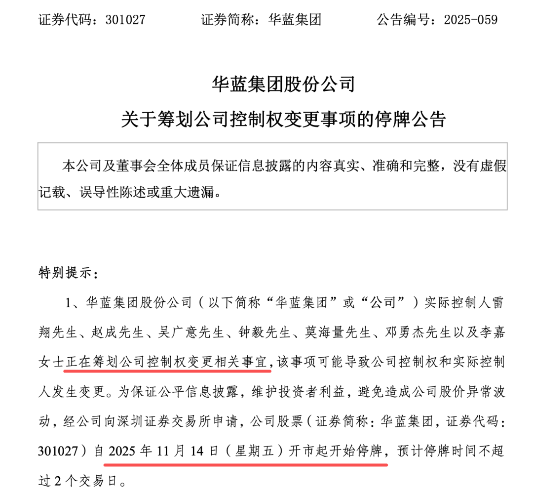 华蓝集团(301027)11月13日公告,公司实控人雷翔、赵成、吴广意、钟毅、莫海量、邓勇杰以及李嘉正在筹划公司控制权变更相关事宜,该事项可能导致公司控制权和实控人发生变更。公司股票自11月14日开市起停牌,预计停牌不超过2个交易日。
