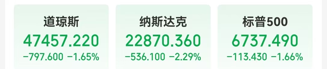 当地时间11月13日,美股三大指数集体收跌,道琼斯指数下跌797.6点,跌幅1.65%;标普500指数下跌113.43点,跌幅1.66%,纳斯达克综合指数下跌536.10点,跌幅2.29%。