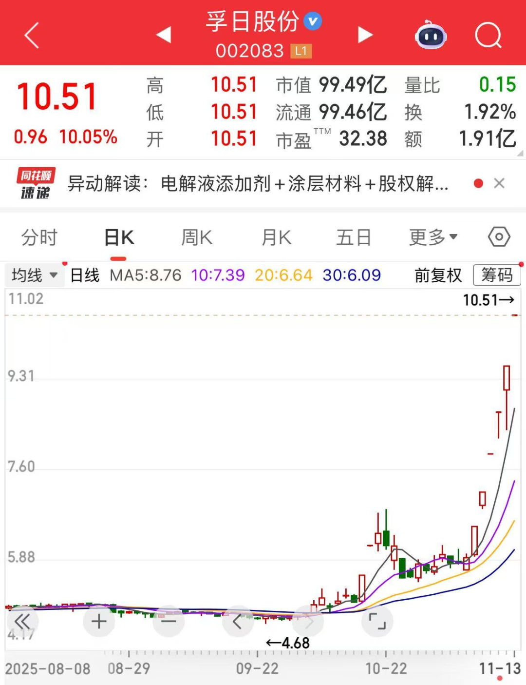 昨日(11月13日),A股锂电产业链全线上涨,尤其是电解液相关的六氟磷酸锂和VC添加剂概念,其中VC添加剂龙头孚日股份已连续6个涨停板。
