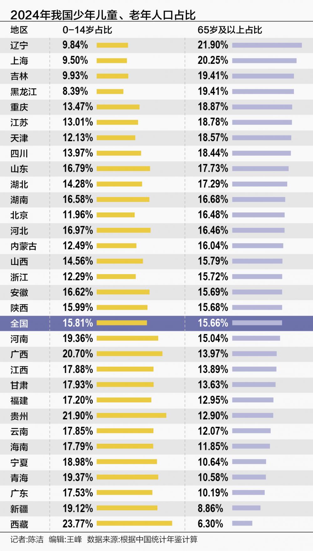 2024年,我国0—14岁人口占比为15.81%,而65岁及以上人口占比达到15.66%,与前者已非常接近。各省的情况各不相同,但是北京、天津、上海、山东等多个省份,65岁及以上人口占比已经超过0—14岁人口的占比。