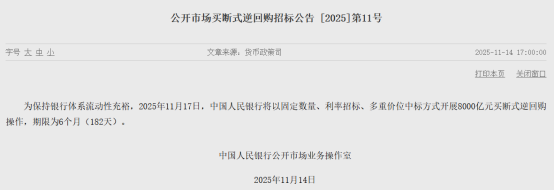 11月14日,中国人民银行(下称“央行”)发布预告称,将在17日以固定数量、利率招标、多重价位中标方式开展8000亿元买断式逆回购操作,期限为6个月(182天)。综合11月操作量与到期量看,本次操作意味着当月央行买断式逆回购将实现加量续作,累计净投放5000亿元。