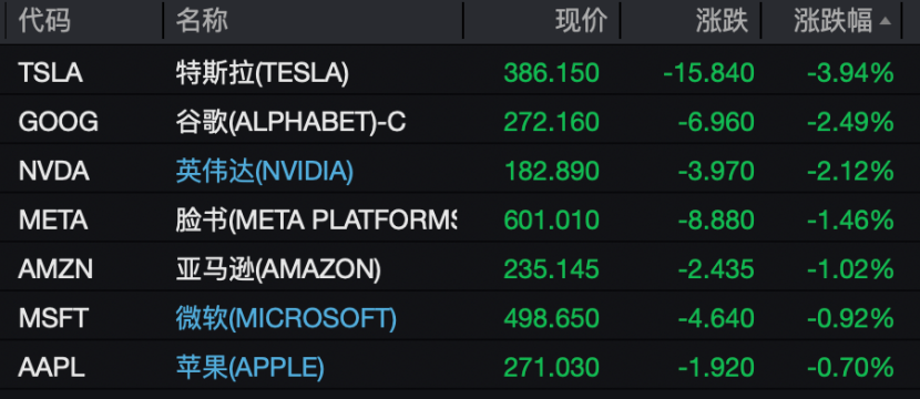 大型科技股中,英伟达下跌2.12%,特斯拉下跌近4%,谷歌下跌2.49%。