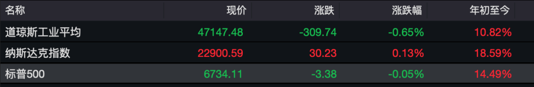 美国三大股指收盘涨跌不一,其中,道琼斯工业指数跌0.65%报47147.48点,标普500指数跌0.05%报6734.11点,纳斯达克指数涨0.13%报22900.59点。本周,道琼斯工业指数涨0.34%,标普500指数涨0.08%,纳斯达克指数跌0.45%。
