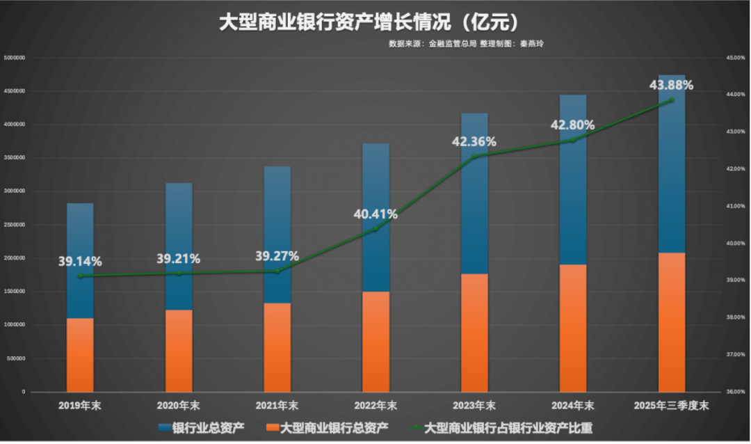 记者梳理2019年末以来的数据发现,今年三季度末,大型商业银行占银行业金融机构总资产的比重已达到近年来的新高——43.88%。