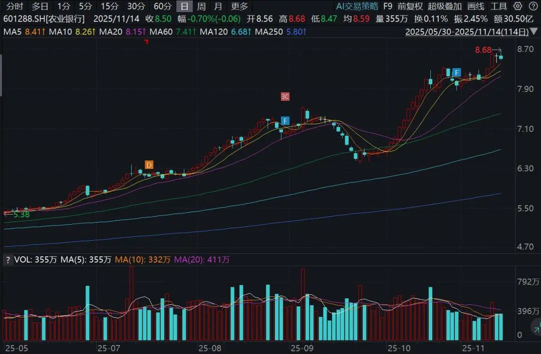 农业银行跑出加速度,连续4年上涨,涨幅一年比一年大,2022年涨8.82%(复权,下同),2023年涨42.79%,2024年涨60.88%,今年以来涨66.67%,4年累计大涨317%。工商银行、建设银行、中国银行同期也分别大涨141%、122%、175%。