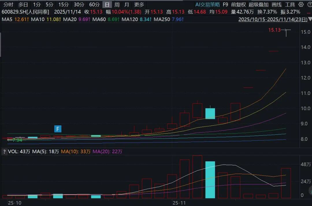 大健康产业牛股辈出,合富中国(603122)14个交易日12涨停,累计飙升逾265%,人民同泰(600829)连续5日涨停,金迪克5日3板,盘龙药业、众生药业均3日2板,特一药业4日2板。