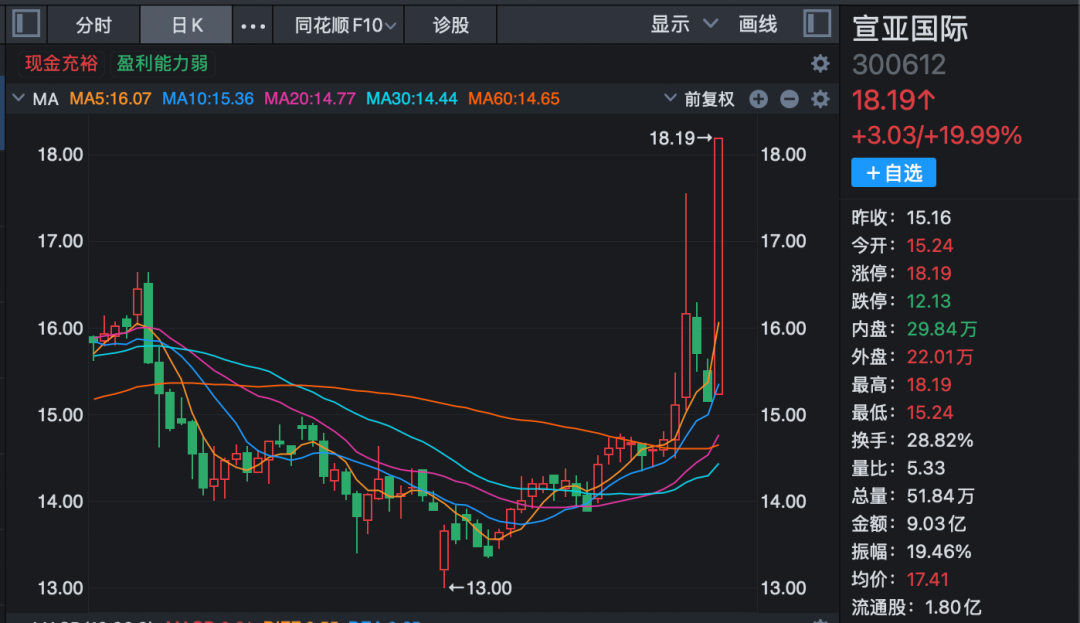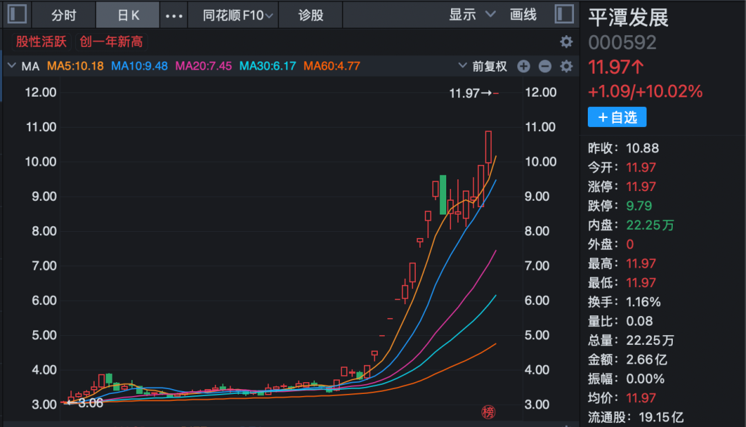 其中,平潭发展延续狂热涨势,再度一字涨停,该股报11.97元/股,走出“21天13板”的强势行情。自10月17日启动上涨以来,该股股价累计涨幅达255.19%,总市值从65亿元飙升至231亿元,成为近期A股市场最受关注的异动个股。
