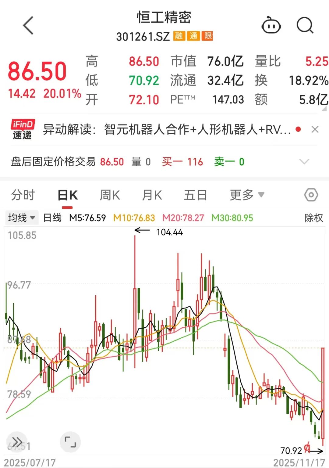 恒工精密(301261)在尾盘阶段突然拉升,收盘时封住涨停,单日振幅超过20%。该股为人形机器人概念股,今年前三季度实现净利润0.78亿元,同比下滑18.68%。