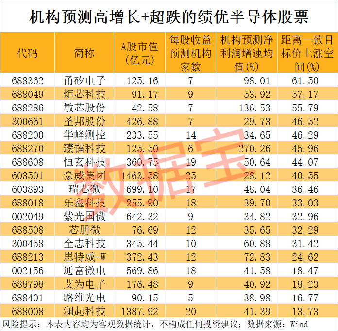 未来增长潜力方面,据数据宝统计,上述50只半导体股票中,根据5家以上机构一致预测,2026年、2027年净利润增速均有望超20%的有29只。