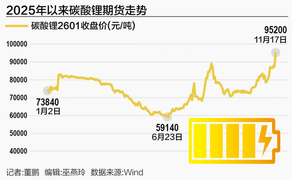 11月17日一开盘,碳酸锂期货迅速拉涨,直至尾盘包括主力2601在内的多个合约集体涨停。
