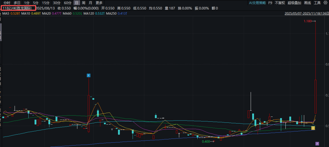 港股市场大幅波动的个股中,胜龙国际大涨,盘中涨幅超过130%。