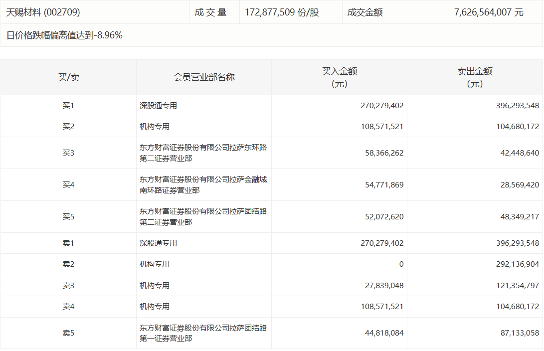 人民财讯11月18日电,天赐材料今日跌停,成交额76.27亿元。盘后龙虎榜数据显示,深股通专用席位买入2.70亿元并卖出3.96亿元,3家机构合计净卖出3.82亿元。