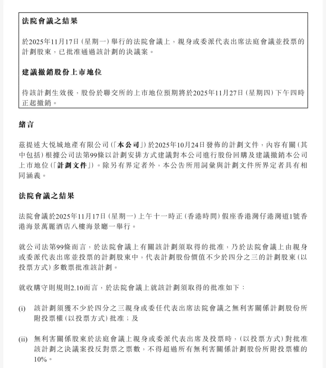 11月17日盘后,大悦城地产(00207.HK)披露公告,称公司私有化退市的议案已经获批。