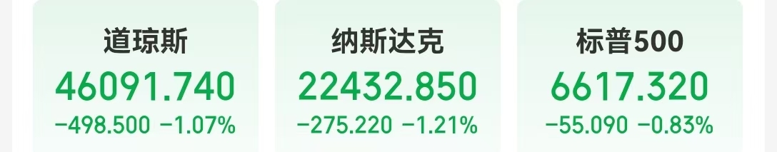 当地时间11月18日,美股三大指数集体收跌,道琼斯指数下跌498.500点,跌幅1.07%;标普500指数跌0.83%;纳斯达克综合指数跌1.21%。