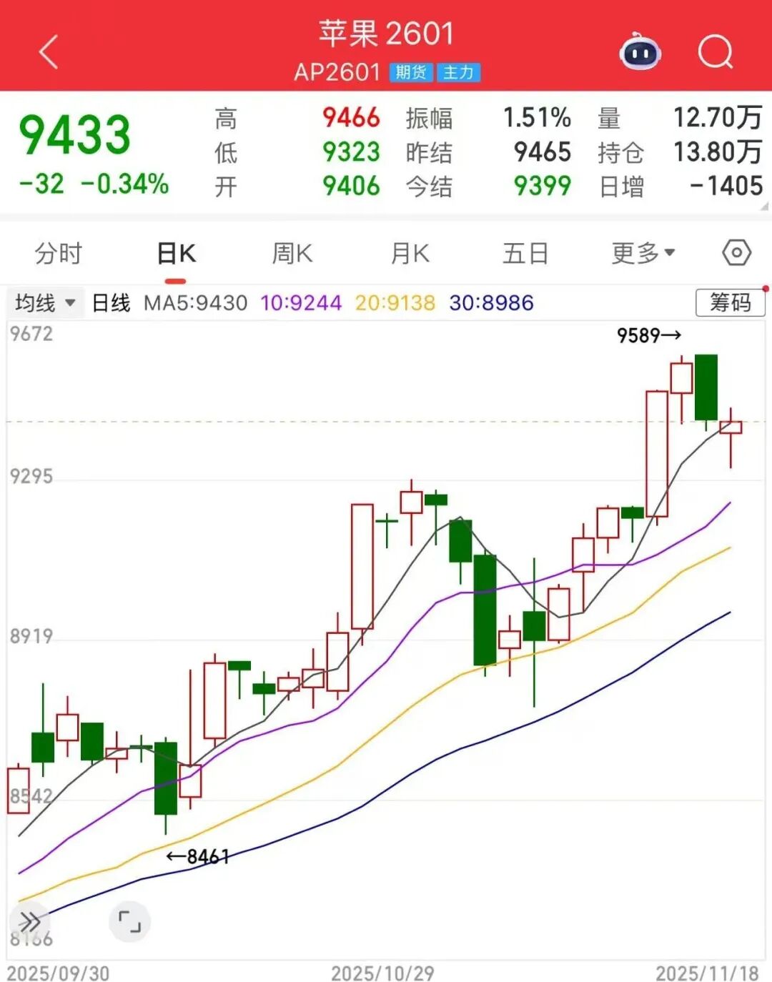 侯芝芳表示,随着产区收购进入后期,苹果期货的定价逻辑逐步由供应端转向消费端,上涨的持续性需要关注消费表现。整体来看,后期苹果期价预计进入高位区间震荡状态,新季苹果减产、质量下降以及收购价格上涨构成价格的下方支撑,而消费驱动力不足构成上方压力。