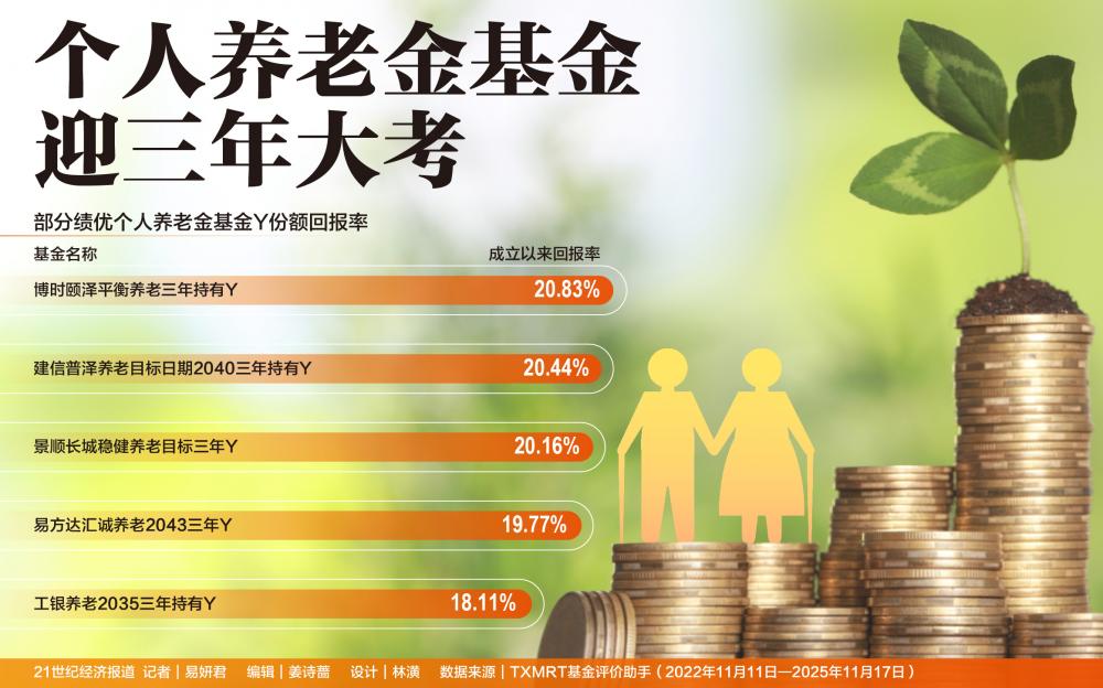 具体来看,截至11月17日,博时颐泽平衡养老三年持有(FOF)Y、建信普泽养老目标日期2040三年持有(FOF)Y、景顺长城稳健养老目标三年持有(FOF)Y自成立以来的回报率分别为20.83%、20.44%、20.16%。
