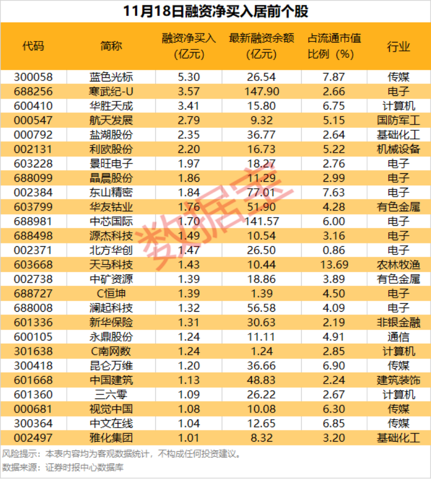 具体到个股,11月18日获融资净买入1亿元以上的有26只。蓝色光标融资净买入额居首,当日净买入5.30亿元;其次是寒武纪-U、华胜天成,融资净买入金额分别为3.57亿元、3.41亿元;融资净买入金额居前的还有航天发展、盐湖股份、利欧股份等。