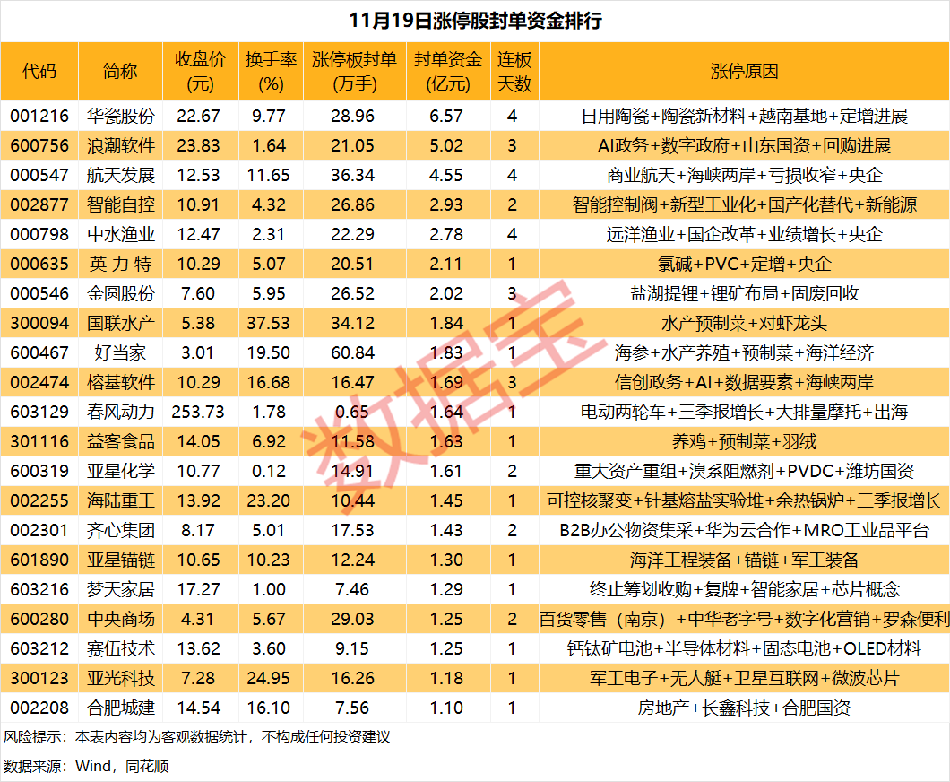 华瓷股份斩获4连板,累计涨幅46.35%。公司主要以日用陶瓷的生产和销售为主,越南生产车间已于8月28日正式开工建设,目前正抓紧施工。截至11月19日收盘,华瓷股份主力资金净流出4996.62万元,净流出额创2025年7月31日以来新高。