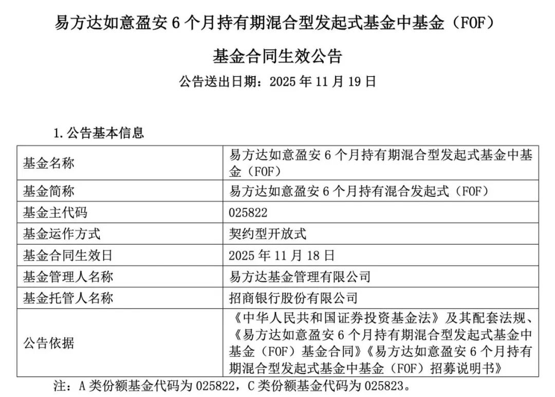 11月19日,易方达基金发布易方达如意盈安6个月持有混合发起式(FOF)基金合同生效公告。