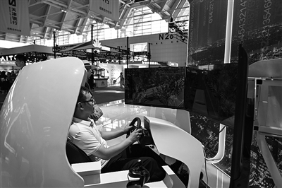 图为参观者在展会现场体验天津大学设计研发的一款可进行多场景智能网联车测试的仿真模拟器。(资料照片)