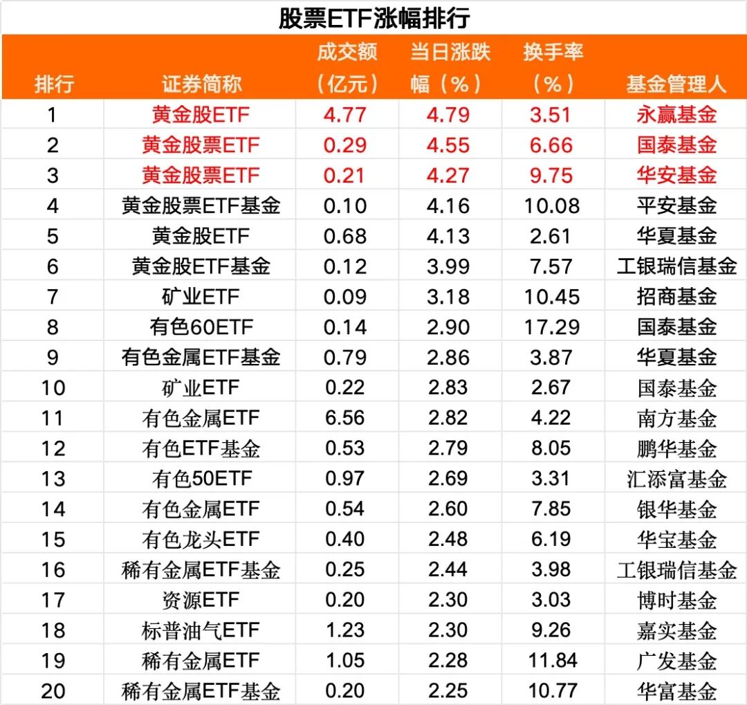 从股票ETF二级市场表现看,黄金股ETF(永赢)大涨4.79%,黄金股票ETF(国泰)涨4.55%,黄金股票ETF(华安)涨4.27%,黄金股票ETF基金(平安)、黄金股ETF(华夏)涨幅也均超4%。