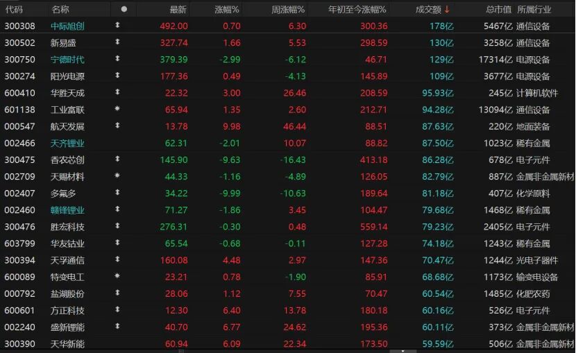 市场仅有1453只个股收涨,涨停股49只;3850只个股收跌,跌停股20只。今日仅有4只个股日成交额超过100亿元,中际旭创微涨0.7%报492元/股,新易盛收涨1.66%报327.74元/股,阳光电源微涨,但宁德时代跌近3%报379.39元/股。航天发展涨停,华胜天成收涨3%,而天齐锂业、赣锋锂业均跌约2%,香农芯创收跌9.63%,多氟多跌停。